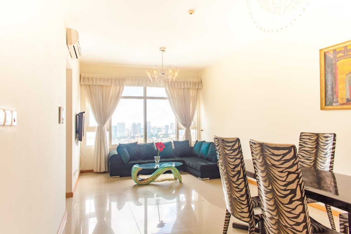 Căn hộ có diện tích 86m2 được thiết kế theo phong cách Maverick độc đáo. Mang dáng dấp của một phong cách hiện đại nhưng đã được tiếp cận với hướng sáng tạo hơn với phòng khách đa năng phân thành hai khu vực riêng biệt. Khu vực giải trí và tiếp khách dễ dàng thu hút mọi ánh nhìn của bất cứ ai khi bước vào căn hộ bởi bộ sofa vải nhung màu xanh đậm cực kỳ sang trọng kết hợp cùng chiếc bàn kính kiểu dáng cực kỳ độc đáo. Khu vực dành cho những bữa cơm lẫn các bữa tiệc thân mật cũng ấn tượng không kém với bộ bàn ăn bốn người gồm chiếc bàn gỗ đen đơn giản nhưng cũng rất ấn tượng cùng 4 chiếc ghế được khoát lên mình chiếc áo họa tiết ngựa vằn sắc xảo.